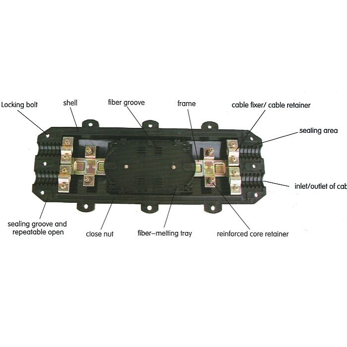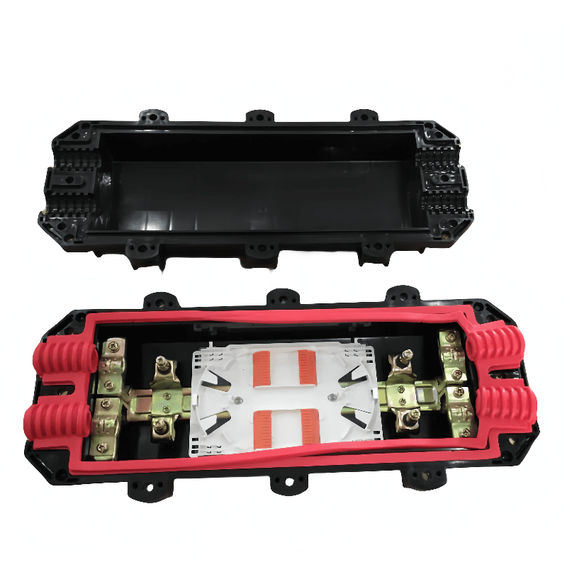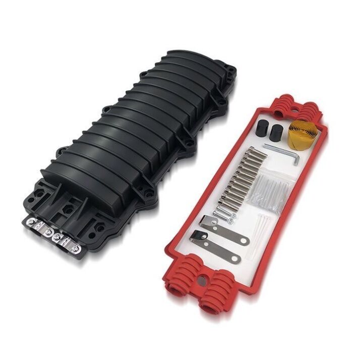 Este cierre de empalme horizontal (en línea) aloja de forma segura los cables de fibra óptica empalmados en una carcasa resistente a la intemperie. Se suele utilizar en instalaciones enterradas directamente, aéreas o de tuberías, ya que ofrece una gran resistencia mecánica y protección frente a condiciones ambientales adversas.